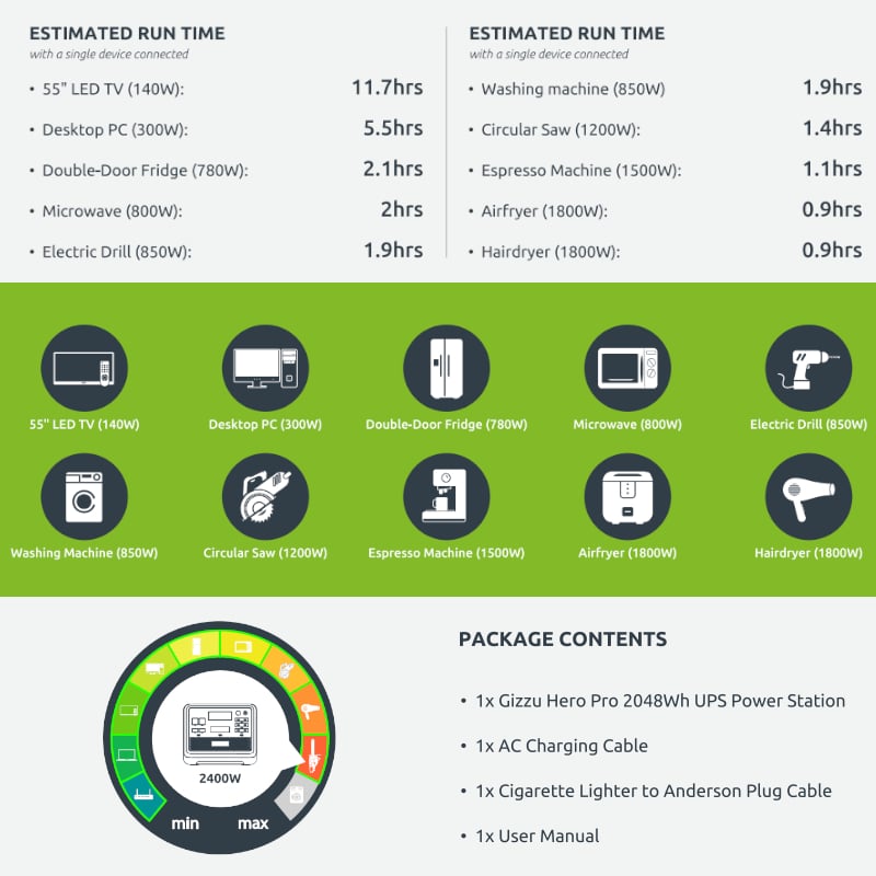 Deliver power wherever and whenever you need it with the portable Gizzu Hero Pro UPS Power Station. The Hero Pro offers 2048Wh of battery capacity. It's great for keeping your devices charged during outdoor adventures and powering most household appliances during loadshedding. The elegant design is durable, robust, and can be taken with you on any adventure.