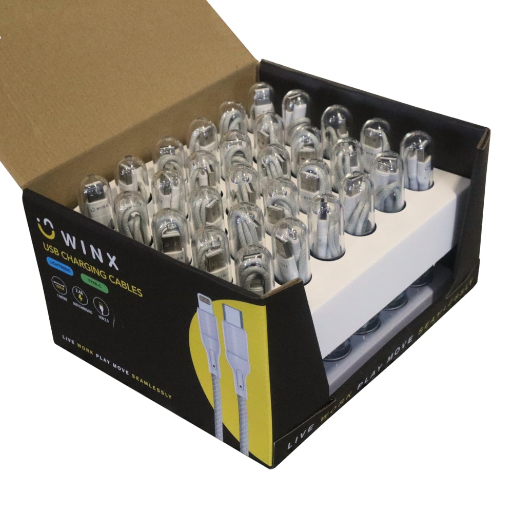 The WINX USB Charging Cables Set are the ideal solution to charge your mobile devices. Ideal for Apple devices, whether you need a USB to Lightning cable or a USB to Type-C cable, we have you covered. These durable cables come in a 1m length with a nylon braided design and support 2.4A Fast Charging. This set includes 15 x USB to Lightning cables and 15 x USB to Type-C cables and can be stored in the included charging cable display box.